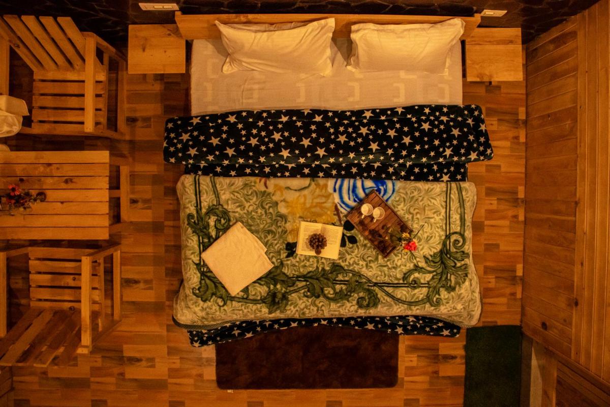 Forest Escape Cottages in Banjār mit Blick auf die Berge bietet Unterkunft, einen Garten, eine Terrasse und eine Bar.