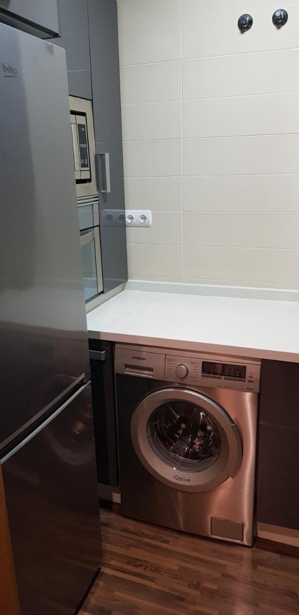 Gut ausgestattete Küche mit einer Waschmaschine und Zugang zur Terrasse zum Trocknen von Kleidung.