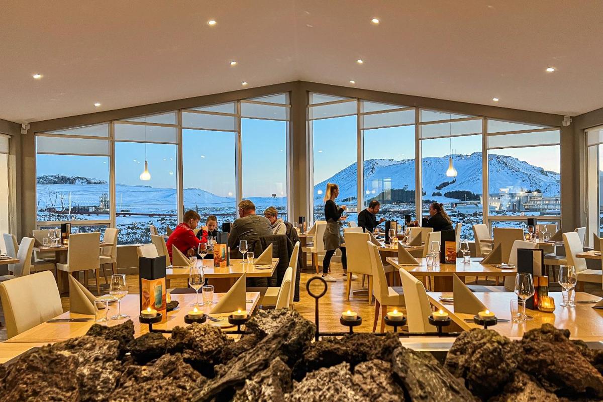 Jedes Zimmer im Northern Light Inn verfügt über modernes Dekor, einschließlich Down-Bettdecken und Holzmöbel, komplett mit Smart-TVs, elektrischen Kesseln, Sitzbereichen und kostenlosen Wi-Fi-Zugang. Die Badezimmer sind mit Hadern und Toilettenartikeln ausgestattet, um einen komfortablen Aufenthalt zu gewährleisten. Die Gäste können die isländische Küche im exquisiten Restaurant des Resorts genießen, das die malerische Reykjanes-Halbinsel überblickt und atemberaubende Ausblicke in raumhohe Fenster anbietet.