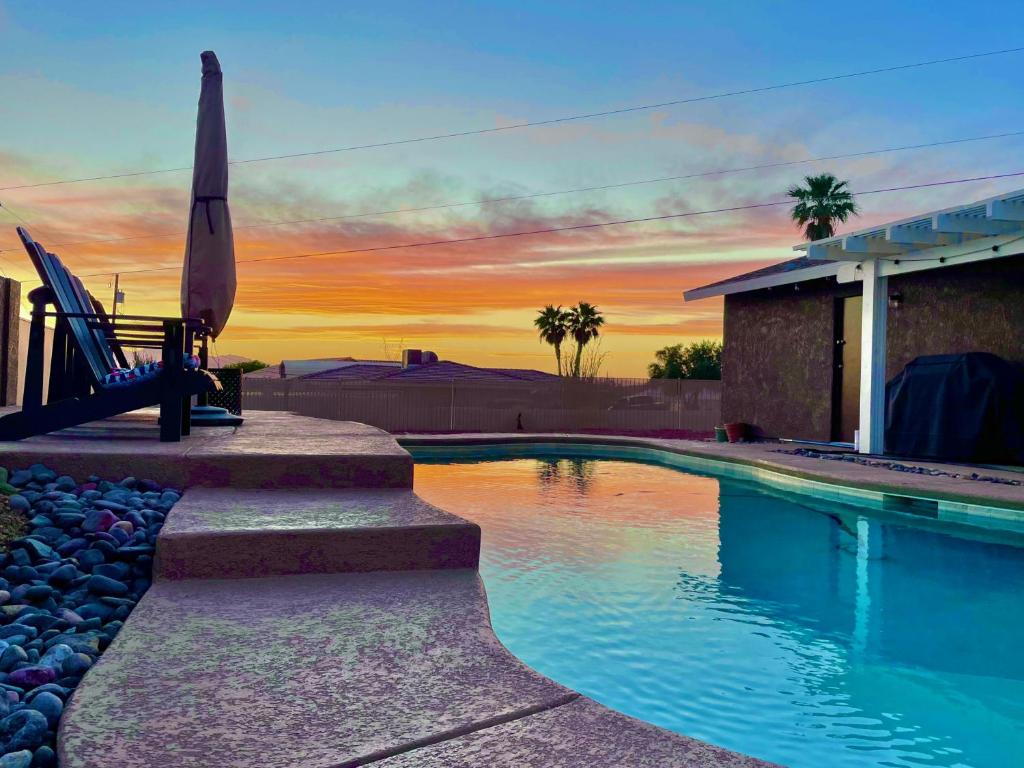 Casa Azul Havasu, eingebettet in der Nähe von OHV Access, bietet einen ruhigen Rückzugsort mit geräumigen Unterkünften mit Blick auf die Berge. Dieses charmante Ferienhaus verfügt über drei Schlafzimmer, die jeweils mit modernen Annehmlichkeiten ausgestattet sind, einschließlich einer voll ausgestatteten Küche mit Spülmaschine, Ofen und Waschmaschine/Trockner. Die Gäste können einen erfrischenden Einbruch im Outdoor-Pool genießen und während des gesamten Aufenthalts kostenlose WLAN ausnutzen. Private Badezimmer vervollständigen das Innenarchitektur und gewährleisten Komfort und Bequemlichkeit. Die geräumigen 114 Quadratmeter der Unterkunft bieten ausreichend Platz für Entspannung und Erholung. Für diejenigen, die Haustiere lieben, begrüßt dieses Ziel sie mit offenen Armen. Die Umgebung im Freien beinhaltet eine Terrasse, die angenehme Sitzmöglichkeiten bietet und jeden Moment unvergesslich macht.